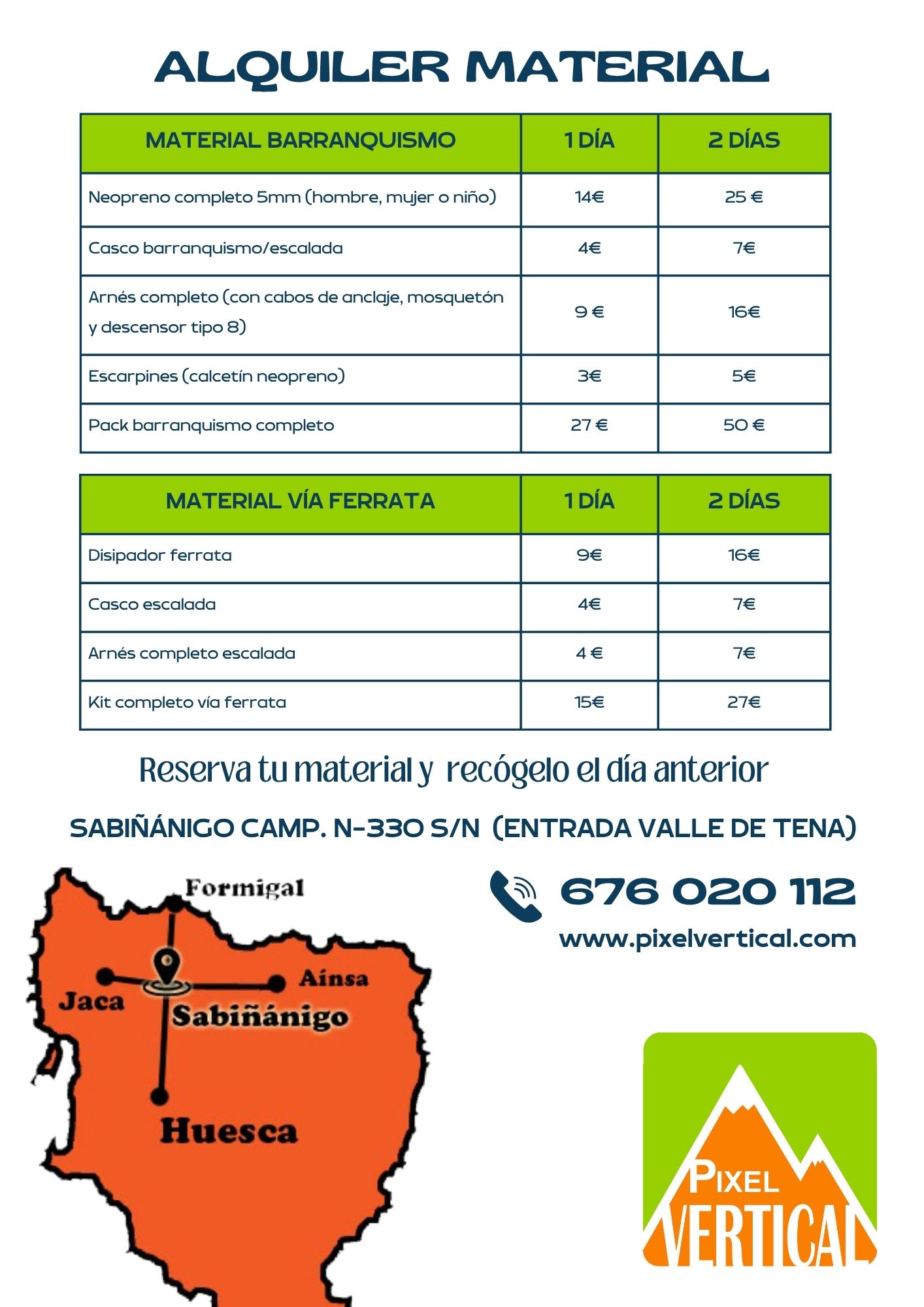 Puedes alquilar el material que necesitas para tus actividades en el Pirineo. Nos encontramos de camino al Valle de Tena o a Ordesa tanto viniendo desde Jaca o subiendo desde Madrid o Zaragoza. Tenemos un horario flexible, solo tienes que escribirnos previamente y te dejaremos preparado el material que quieras alquilar para que no pierdas tiempo. Tenemos nuestra base en Sabiñánigo camp, el camping que hay frente al polígono industrial de Sabiñánigo. Un sitio estratégico de fácil acceso y cómodo aparcamiento.