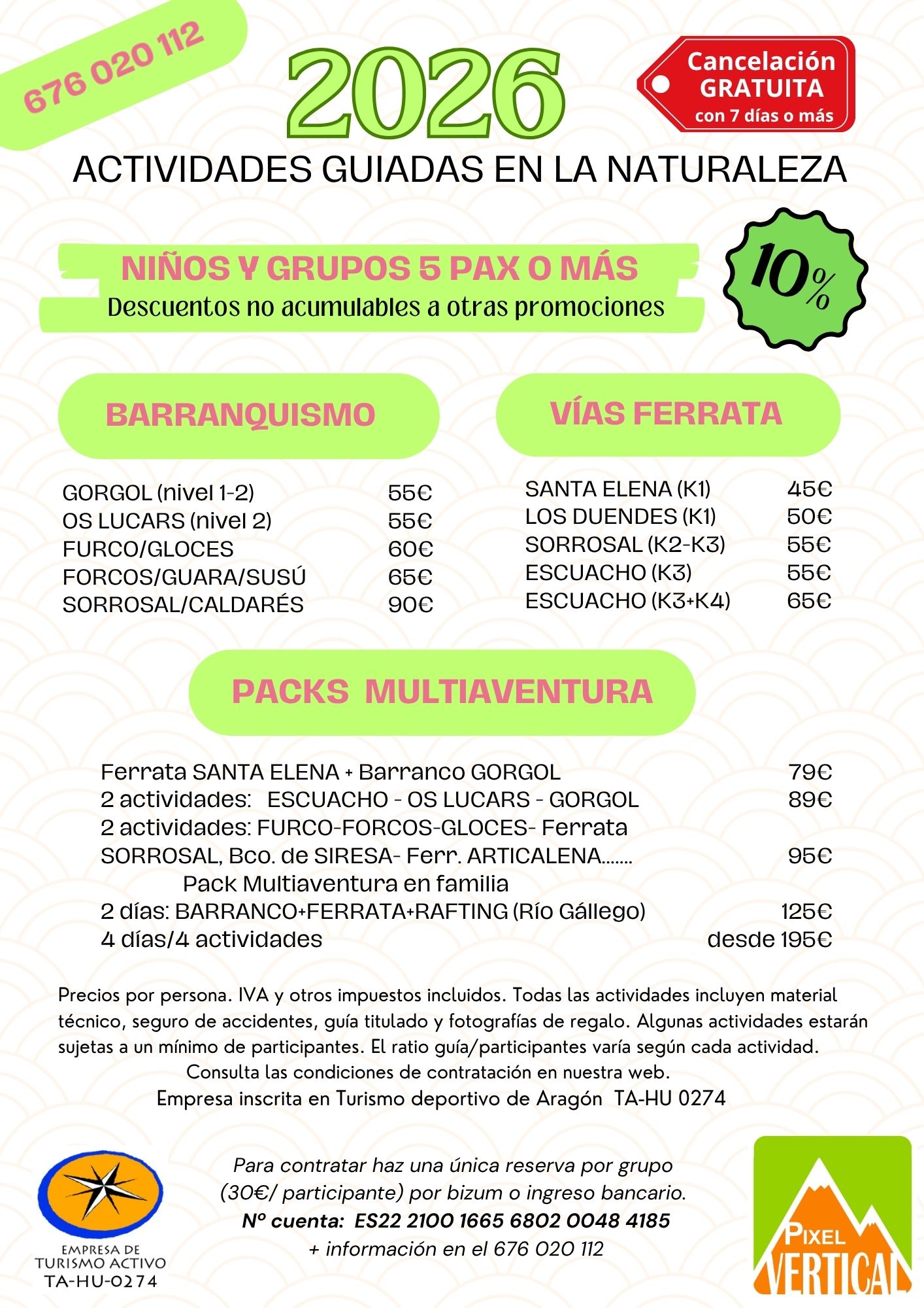 Pixel Vertical es una empresa de turismo activo ubicada en Sabiñánigo (Huesca). Guías de montaña y descenso de barrancos en el Pirineo Aragonés (Valle de Tena, Ordesa…).